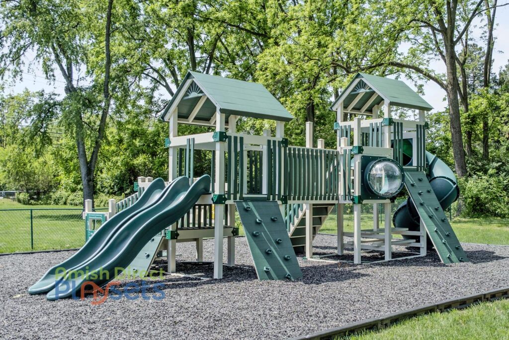 The playground sits on un-dyed black rubber mulch, bordered with plastic edging for a clean, finished look. This low-maintenance surface adds safety and helps keep mess to a minimum. Like all Amish Direct Playsets, Lincoln’s Labyrinth combines handcrafted quality with commercial-grade durability—built to last and designed to bring families together.