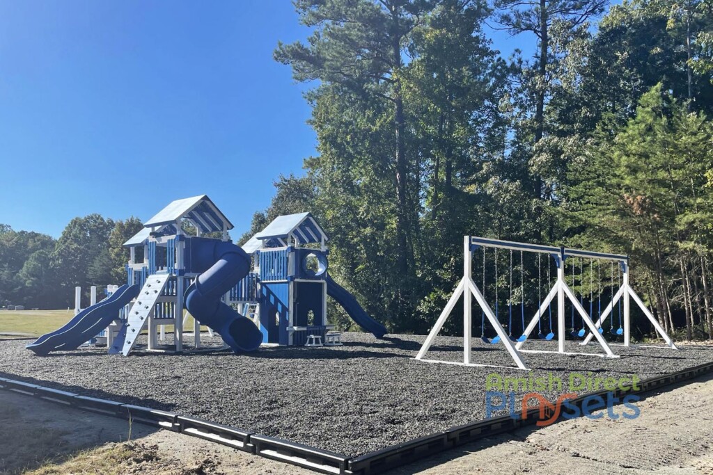 Concord Baptist Church has enhanced its outdoor space with a custom vinyl playset from Amish Direct Playsets, designed to provide a fun and safe environment for children. Built with durable, low-maintenance vinyl, the playset ensures long-lasting use while featuring engaging activities that encourage active play. The addition of un-dyed black rubber mulch creates a cushioned surface that enhances safety and gives the area a clean, polished appearance, neatly contained by a standard border for an organized look. Since its installation, the playset has become a vibrant focal point, offering a reliable and enjoyable space for gatherings and activities.