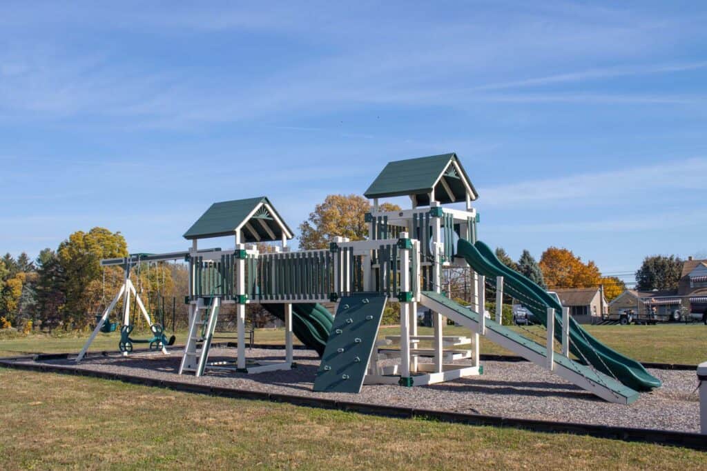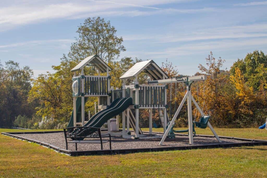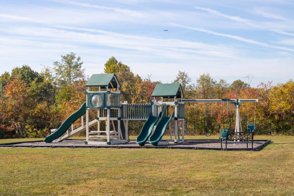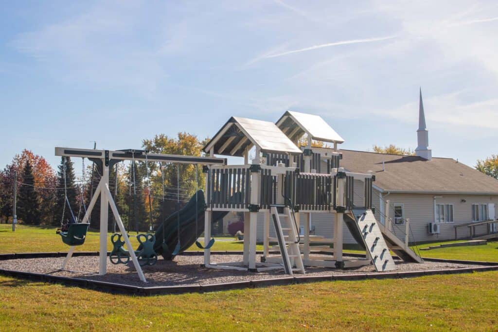 Cornerstone Baptist Church collaborated with Amish Direct Playsets to create a custom vinyl playground. Featuring mulch and a secure border, this tailored play area provides a safe and enjoyable environment for the church’s children. The playground has added a lively new dimension to the church grounds, offering a delightful place for kids to play and interact.