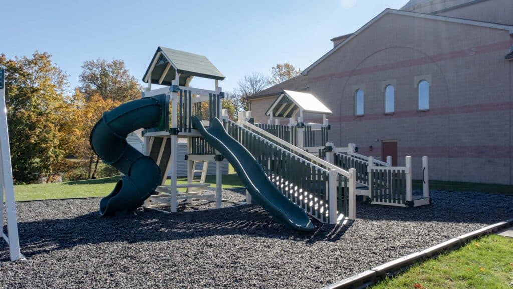 St. John Chrysostom Orthodox Church purchased the Lincoln’s Labyrinth ASTM-Compliant Playground from Amish Direct Playsets, complete with rubber mulch and a border. This playground addition enhances their church grounds, providing a safe and engaging play area for children. The Lincoln’s Labyrinth Playground has quickly become a valued asset at St. John Chrysostom Orthodox Church, offering families a fun and secure space to enjoy outdoor activities and community gatherings.