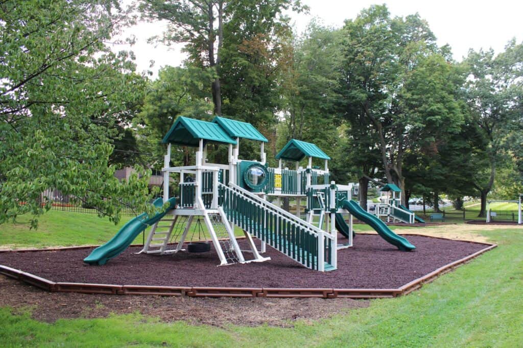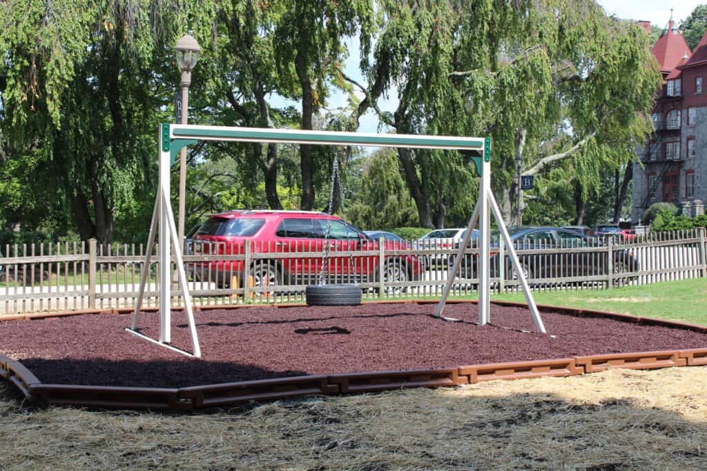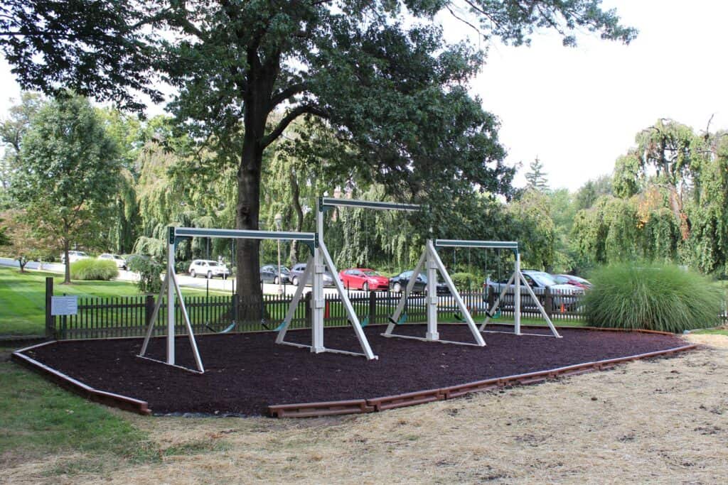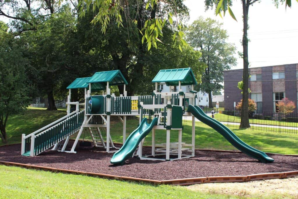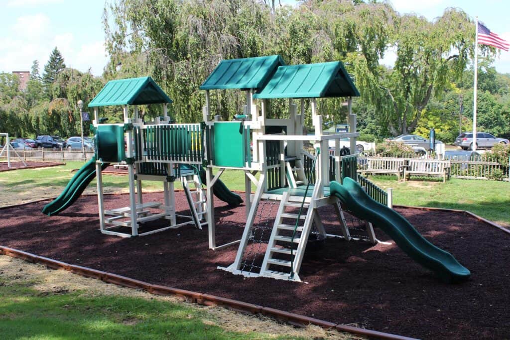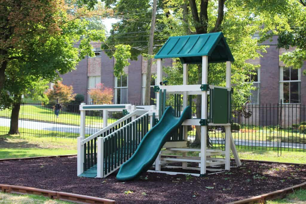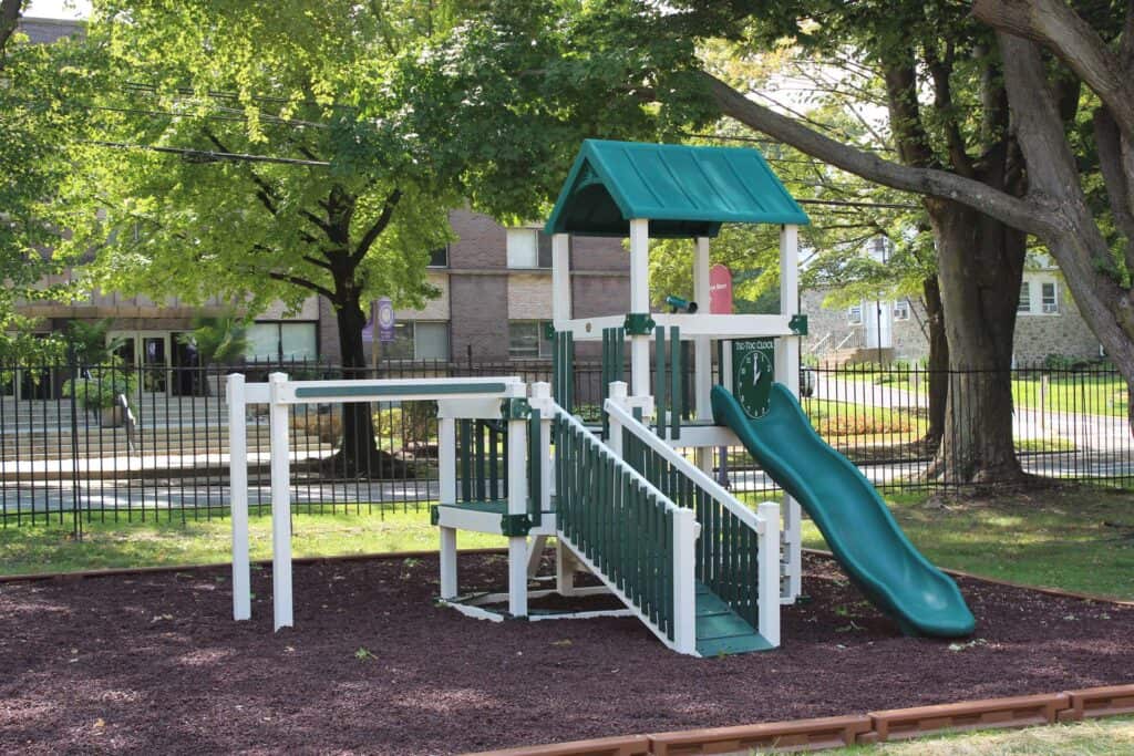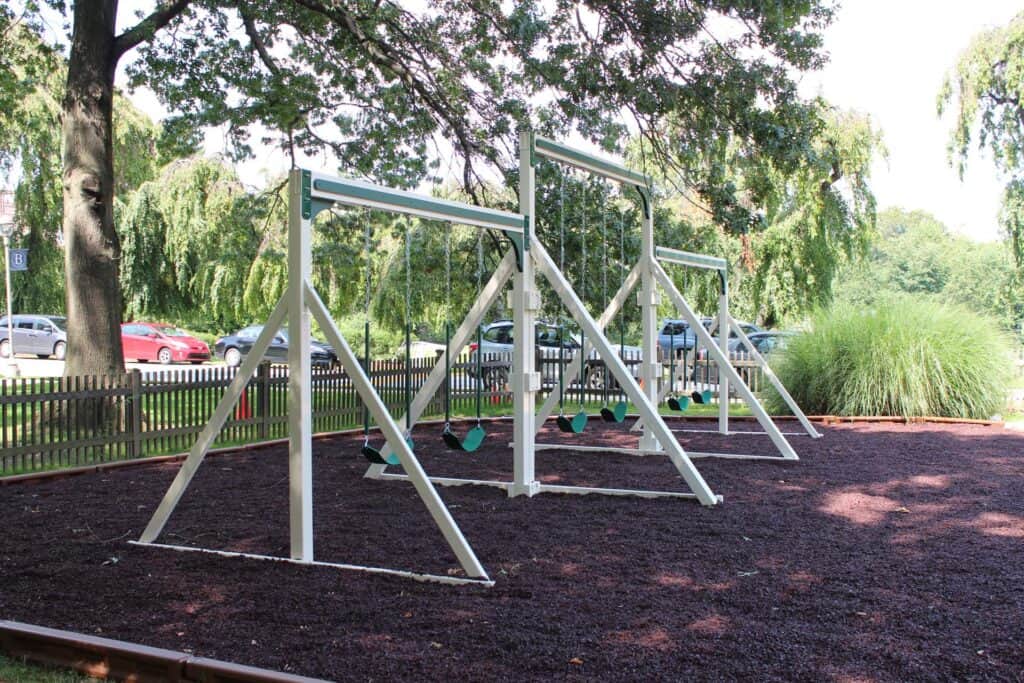 The Baldwin School partnered with Amish Direct Playsets to install two custom vinyl playgrounds, multiple vinyl swing frames, and included rubber mulch and a border. These installations significantly enhance the school’s outdoor recreational facilities, providing students with safe and engaging play areas. The custom designs and high-quality materials reflect The Baldwin School’s commitment to providing an enriched learning environment that supports physical activity and social development. These playgrounds and amenities promote active play and create opportunities for fun and exploration among students.