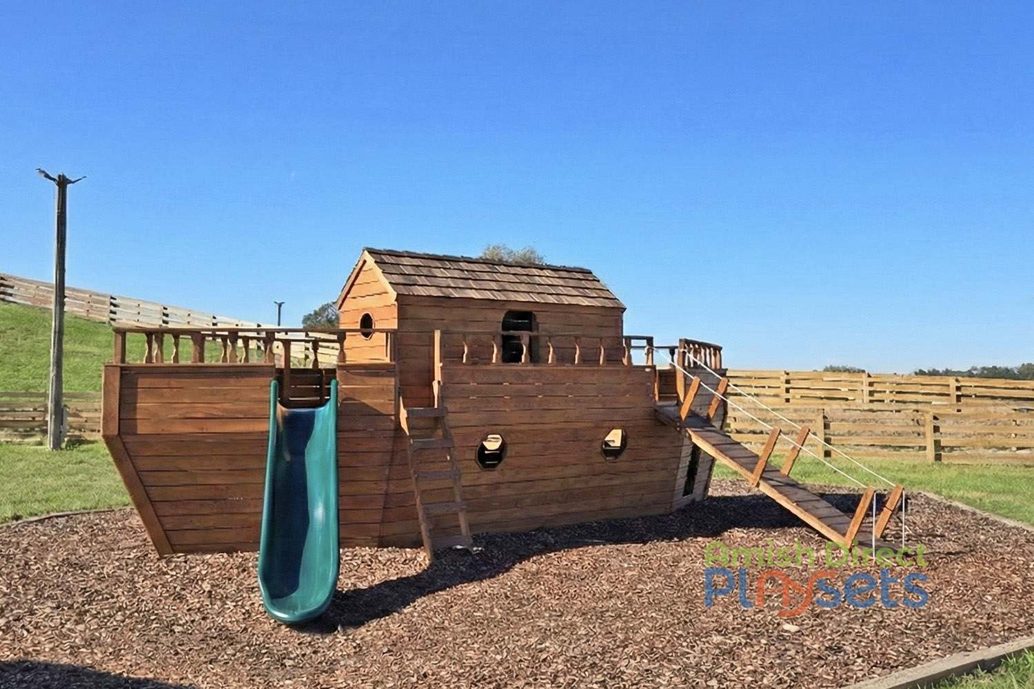 Our large wooden ark playground can inspire imagination and adventure. Measuring 8’ x 30’, this playset offers a spacious and engaging environment for children to explore. The top features a 4’ x 8’ playhouse enclosure, perfect for creative play and storytelling based on the biblical tale of Noah's Ark. Children can embark on their adventures by climbing the ladder, ramp, or rear ground-floor opening, ensuring easy and safe access. The fun continues with a thrilling 10’ slide, providing an exciting descent from the ark's deck.
